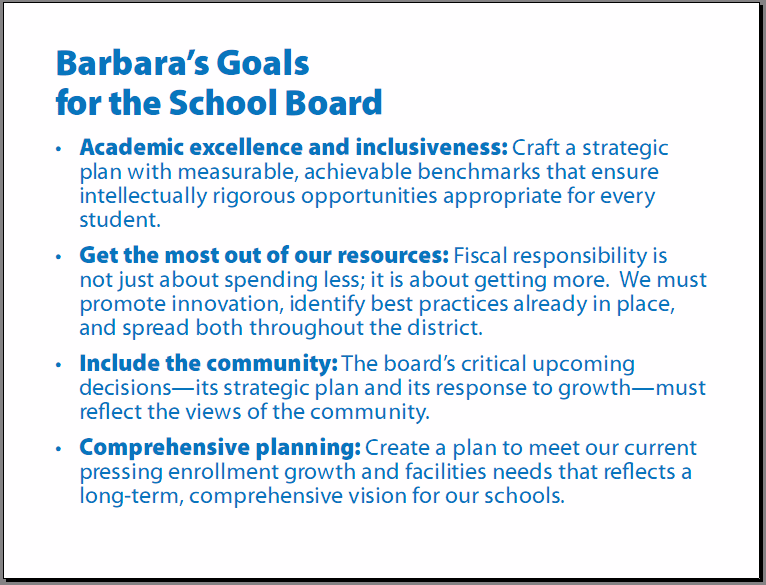 Learn more about Barbara Barbara's Goals for the Board Letter From Barbara Bio Q&A on District Issues Kick Off Speech Kick Off Photos Meet Barbara in Person Upcoming Events Quotations Endorsements Donations and Volunteers News Contact Information Helpful Links *Download Barbara’s Brochure * Download Barbara’s Flyer * School Board Agenda * Vote on Nov 6. Anyone can now vote by mail. Get a ballot here! Home